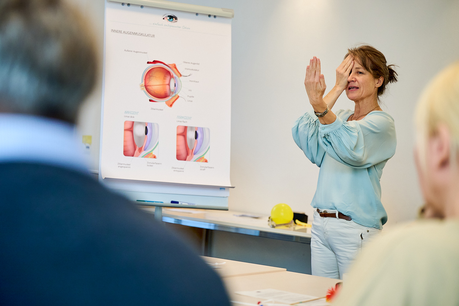 Tanja Berni, Augen-Yoga-Trainerin während eines Augenyoga-Kurses für ein Unternehmen im Rahmen des Betrieblichen Gesundheitsmanagements (BGM)